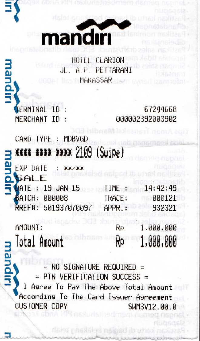 Pada Senin 19 Januari 2015 saya ditemani istri mencari hotel. Hotel pertama yang kami datangi adalah Grand Clarion, di Jalan A.P Pettarani, Makassar. Dengan percaya diri, saya bertanya kepada seorang resepsionis bahwa saya akan mem-booking sebuah hotel untuk besok (20 Januari 2015).